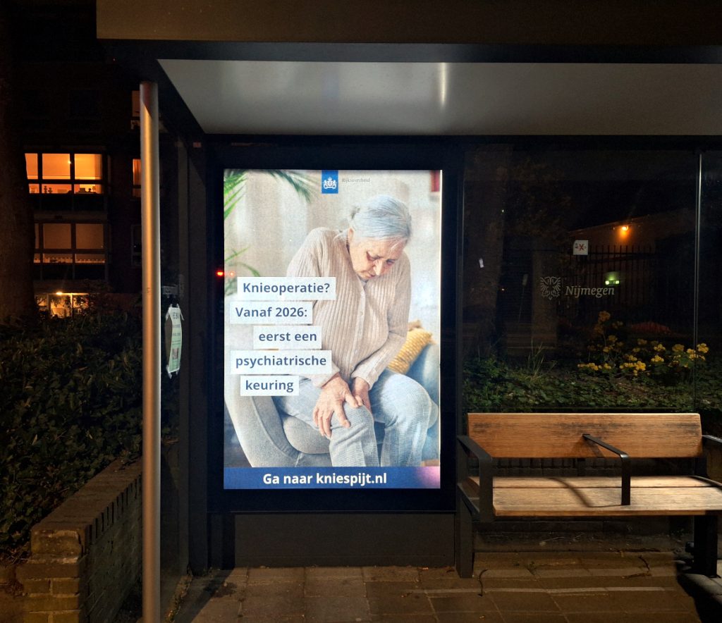 ‘Knieoperatie? Vanaf 2026: eerst een psychiatrische keuring’ is te lezen op posters in bushokjes en langs wegen. Het gaat gelukkig niet om echte Rijksoverheid-posters, maar om een campagne van Trans Zorg Nu. De actiegroep vraagt via kunst en satire aandacht voor hoe absurd transitiezorg de voor transgender personen in Nederland is ingericht.